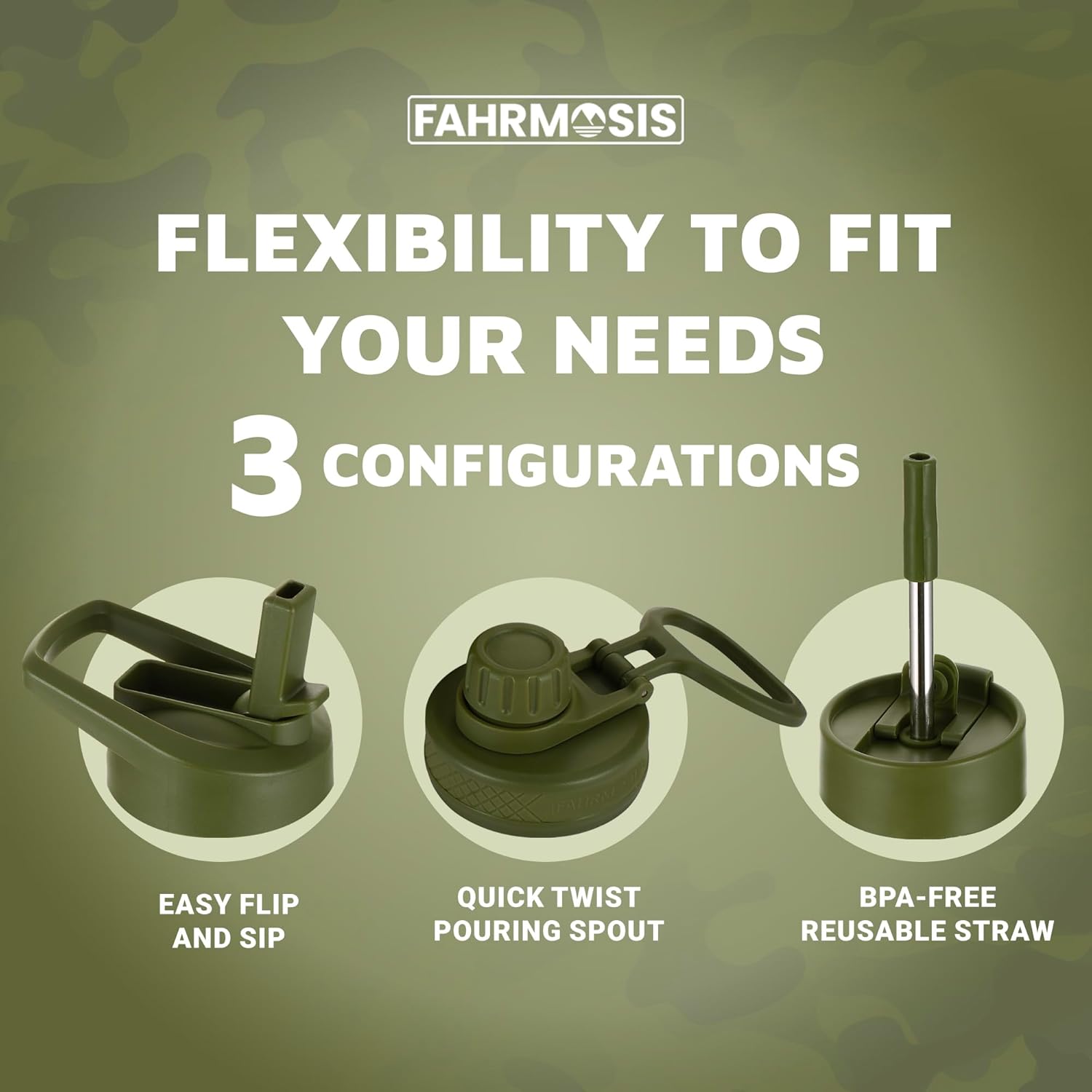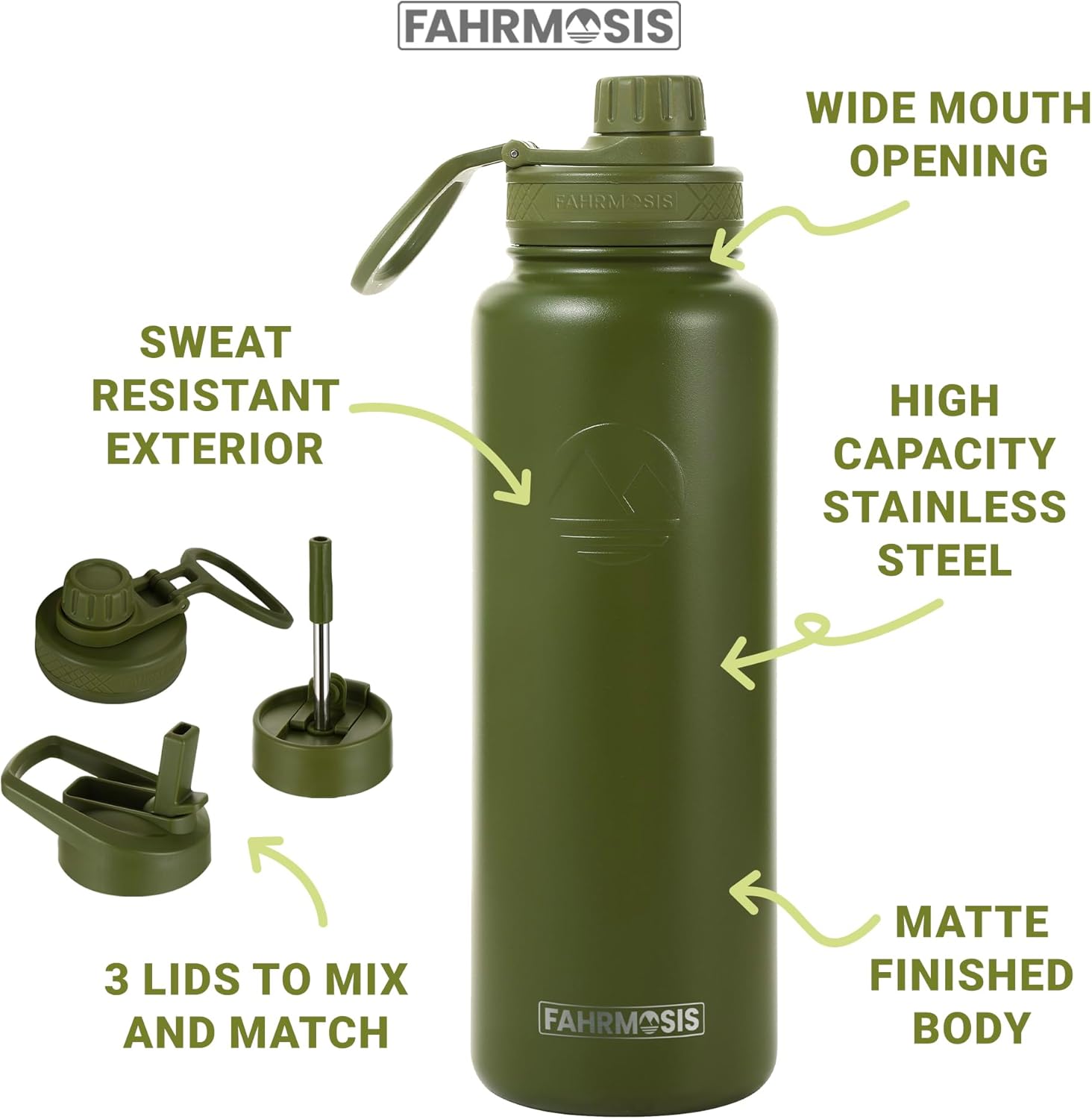40 Oz Water Bottle with Straw Stainless Steel Sports Water Bottle with 3 Lids (Straw, Chug and Flip Lid) Insulated Leak Proof Metal Jug for Men & Women - Army Green