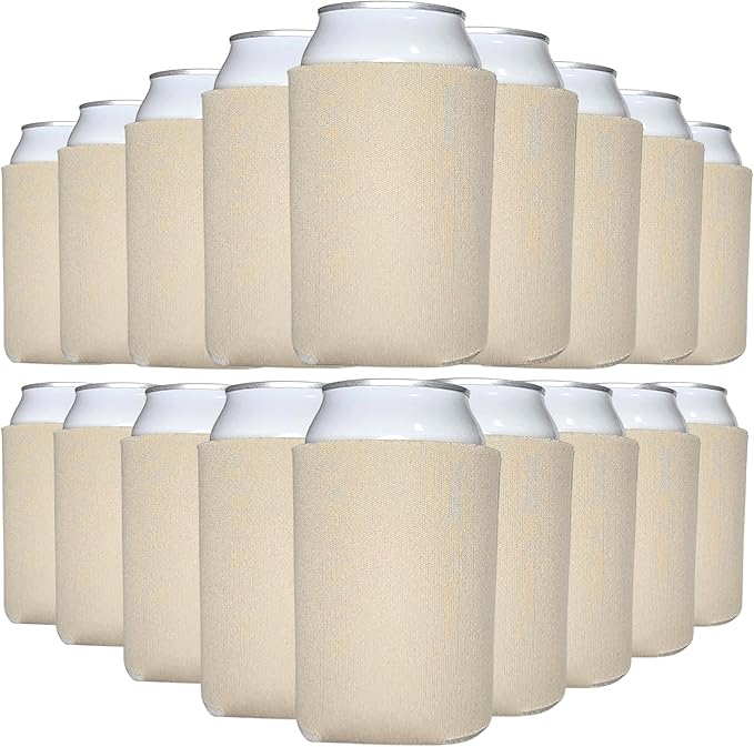 Includes Twenty-Five (25) collapsible foam can cooler blanks. No brand logos or tags. Make your own design with heat transfer vinyl, infusible ink, sublimation, screen printing, direct to film transfer, and fabric markers. Fabric details - scuba knit polyester fabric on premium 4mm thick poly foam insulator. The collapsible design makes them perfect for a heat press or crafting iron. See the video for heat transfer, time, and pressure settings.