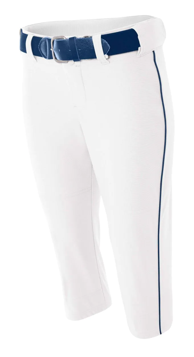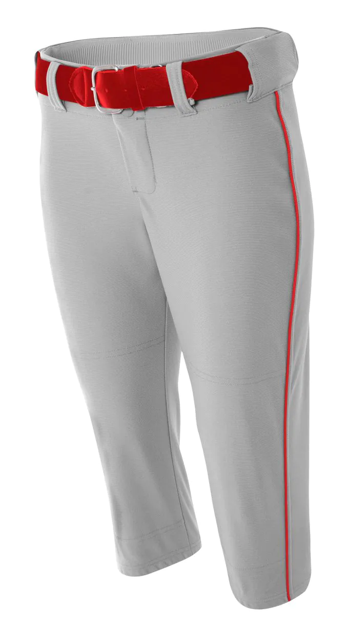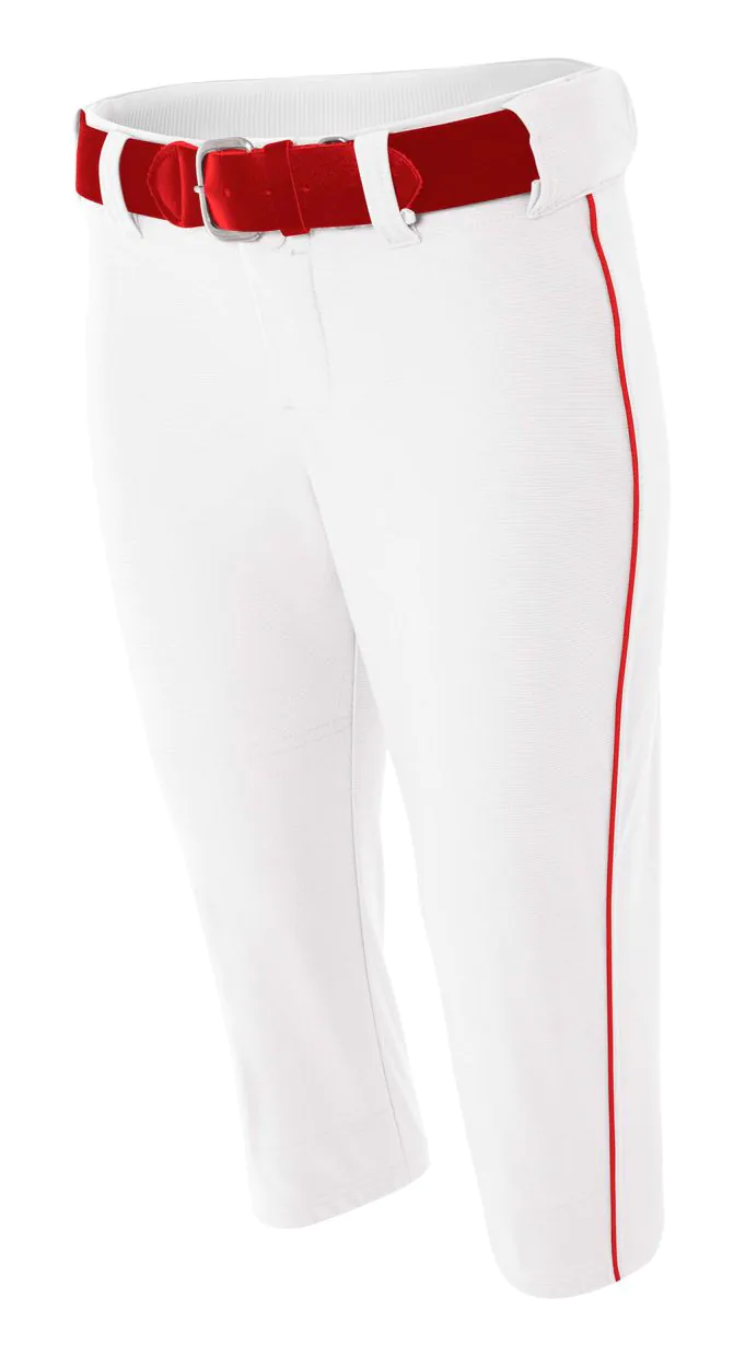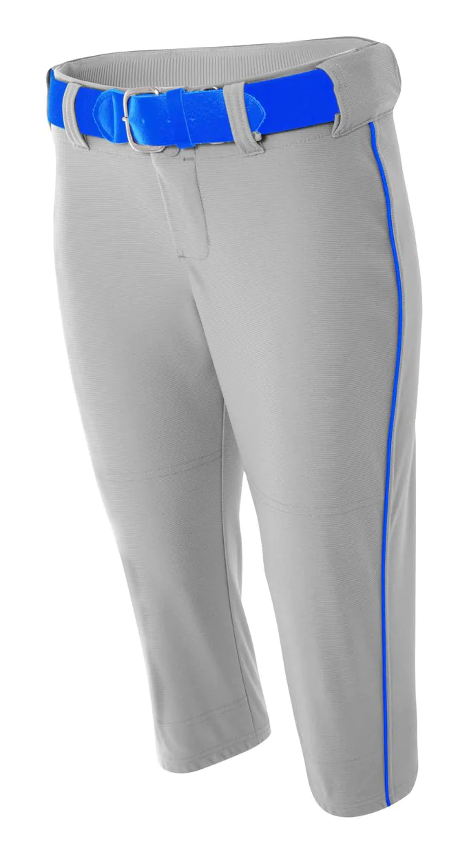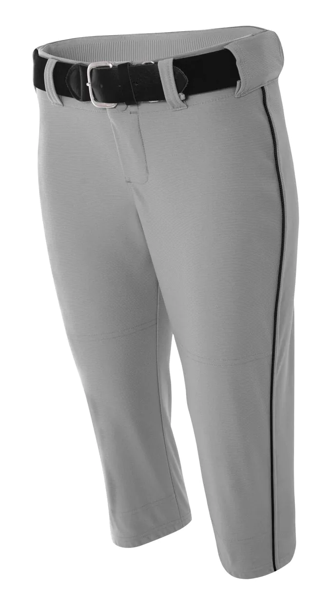 A traditional softball pant, cut for women and made from a double knit polyester for performance and durability.